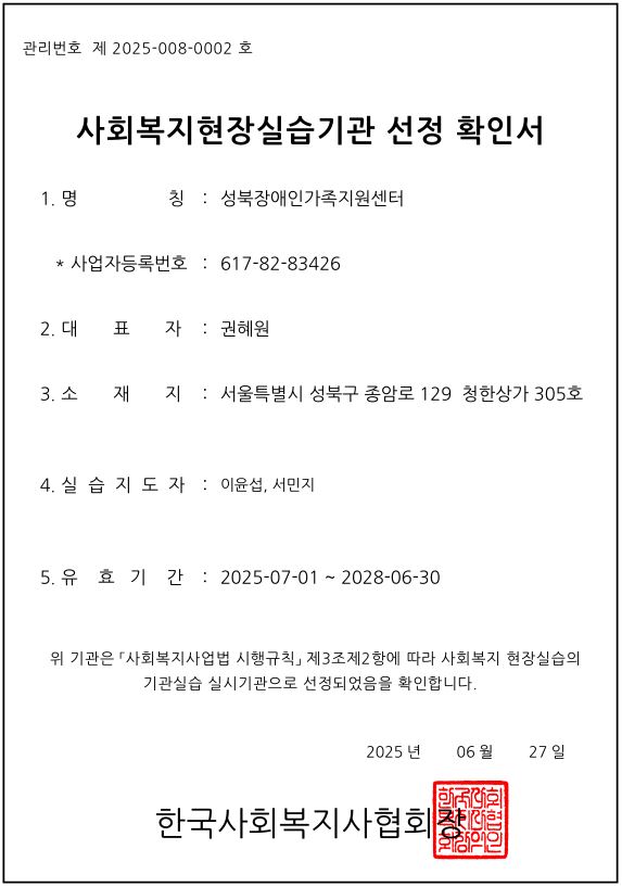 성북장애인가족지원센터가 실습기관으로 선정되었습니다.