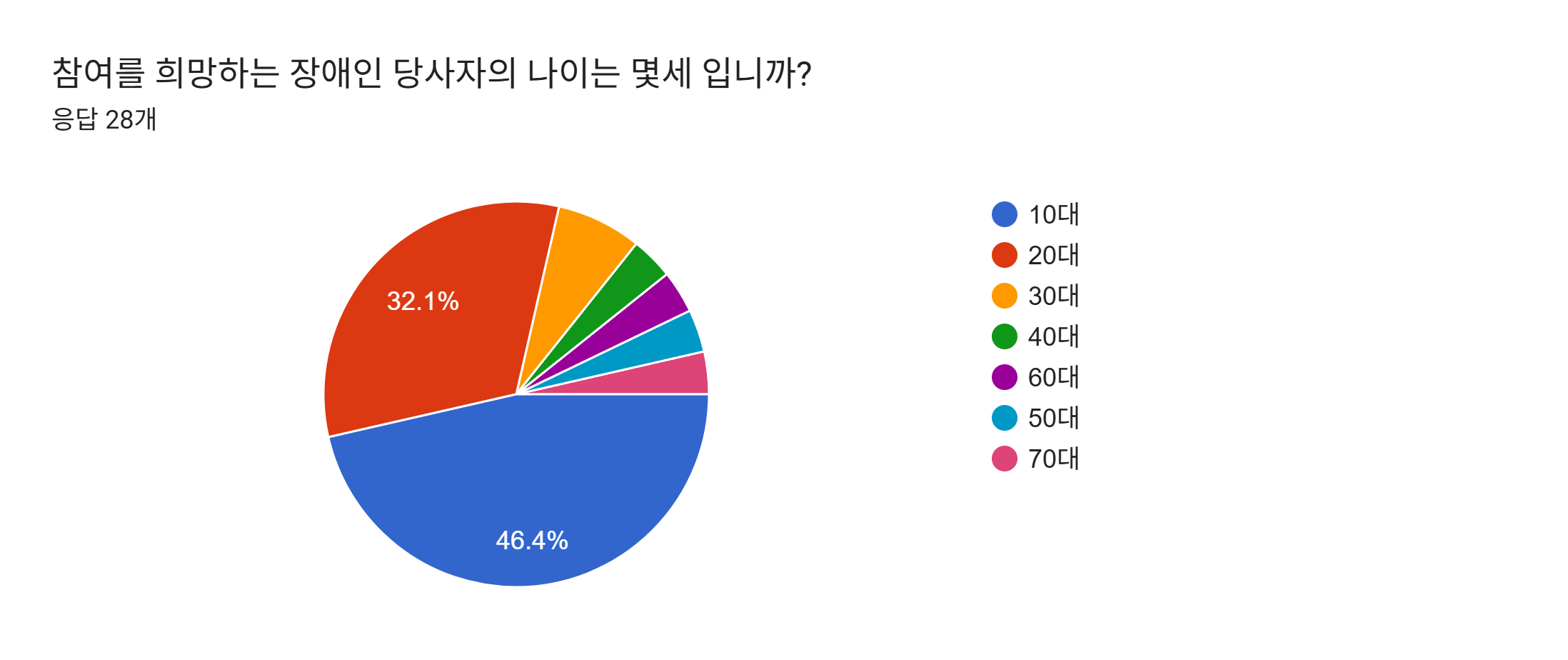 주간활동 참여를 희망하는 장애인의 연령은 10대(46.4%)와 20대(32.1%)가 가장 많았으며,