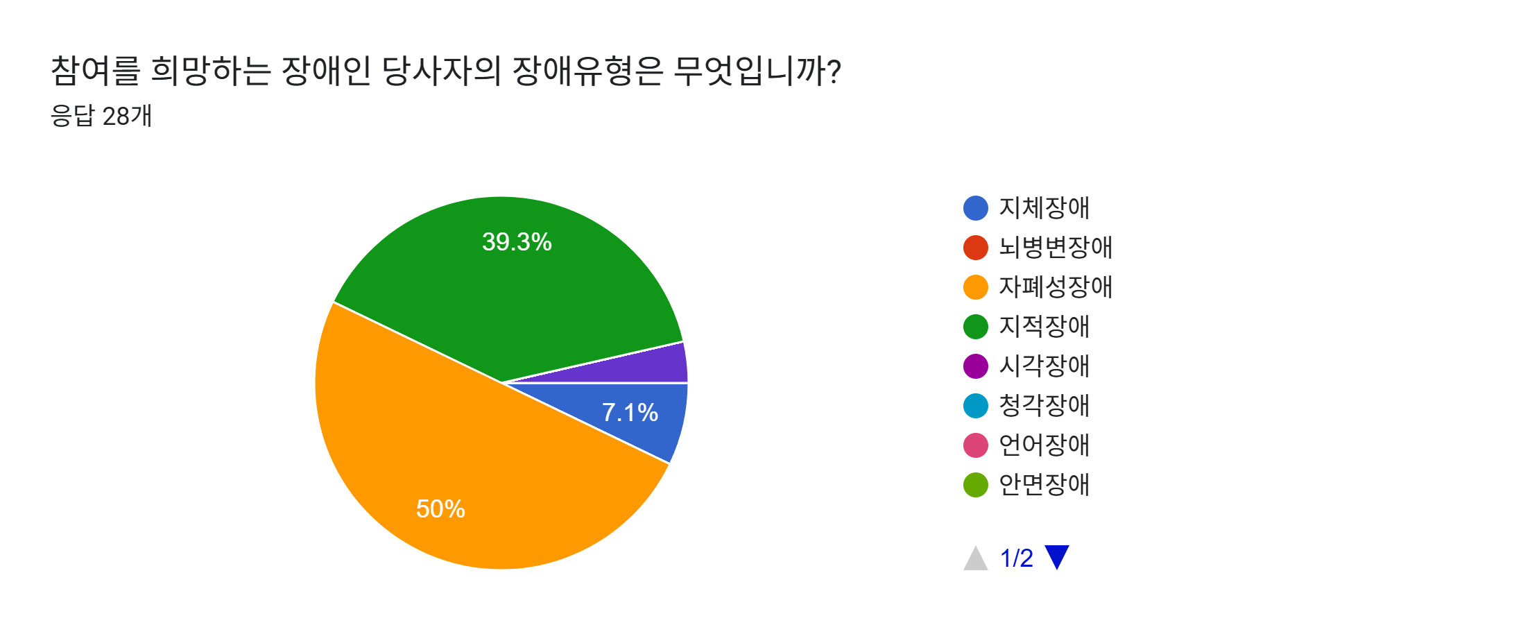 장애 유형은 자폐성 장애(50%)와 지적 장애(39.3%)가 대부분을 차지하는 것으로 나타났습니다.
