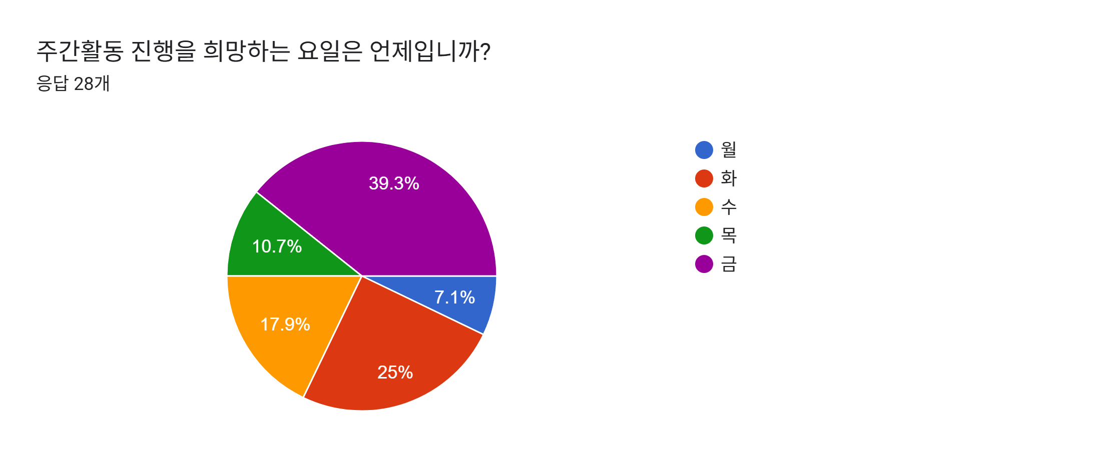요일은 금요일(39.3%), 화요일(25%) 순으로 선호도가 높게 나타났습니다.